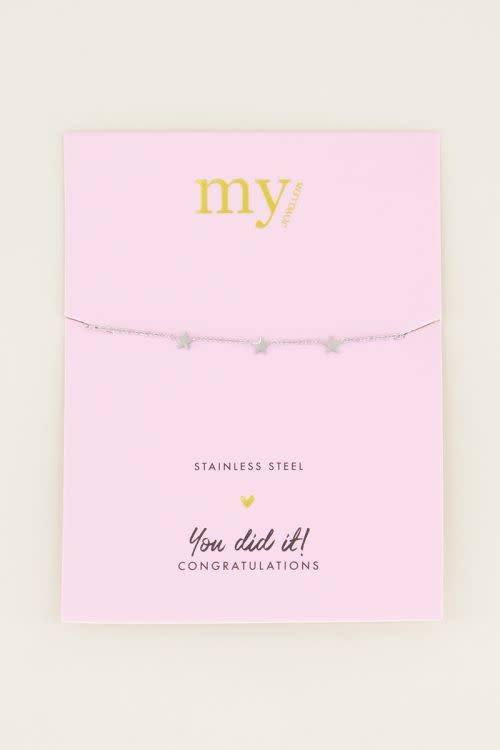Aan verlanglijst toevoegenArmband 3 sterren zilverkleurig €15,99 De Armband 3 Sterren van My Jewellery is het perfecte cadeau voor jouw vriendin, zus, of kennis! Het armbandje is gemaakt van roestvrij staal, wat als voordeel heeft dat het niet verkleurt. Op voorraad Toevoegen aan winkelwagenInloggen voor wishlist