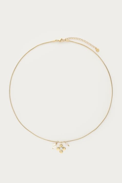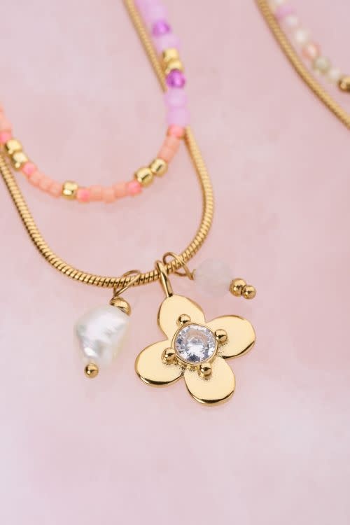 Botanical ketting met bloem en roze strass steen zilverkleurig