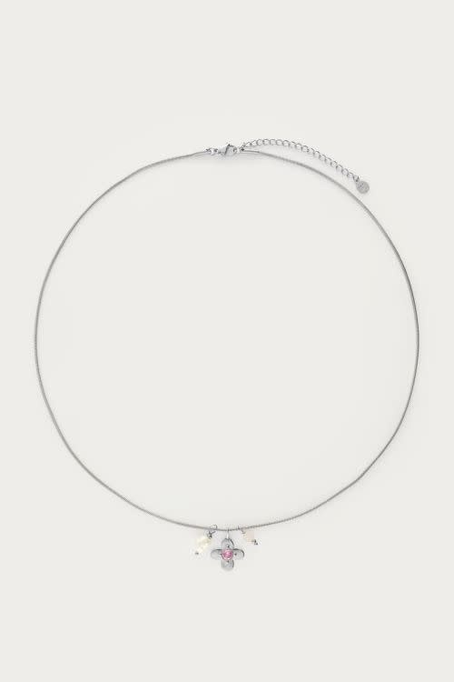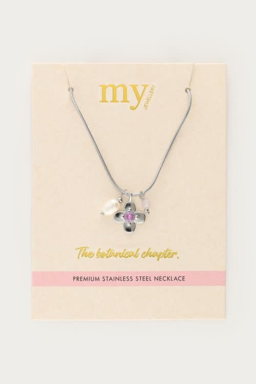 Botanical ketting met bloem en roze strass steen zilverkleurig