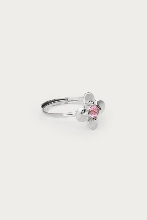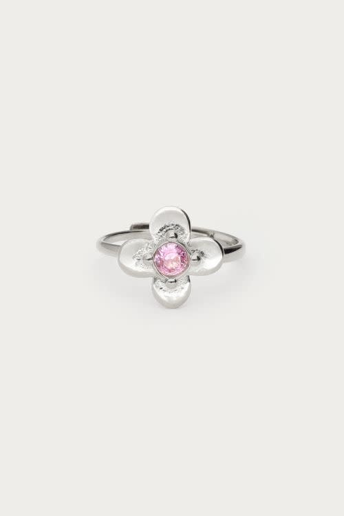 Botanical ring met bloem en roze strass steen zilverkleurig