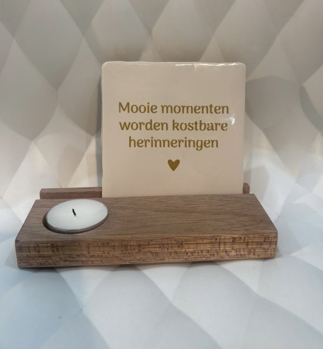 Deze houten display met waxinelicht houder is perfect om een dierbaar tegeltje op te presenteren.