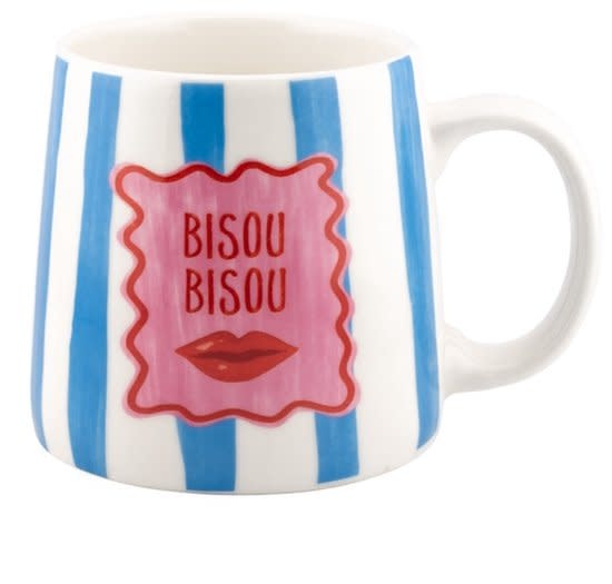 Geef je ochtendroutine een vleugje romantiek met mok Amore. Deze charmante mok, met zijn speelse blauwe strepen en vrolijke roze label met “Bisou Bisou”, tovert gegarandeerd een glimlach op je gezicht.