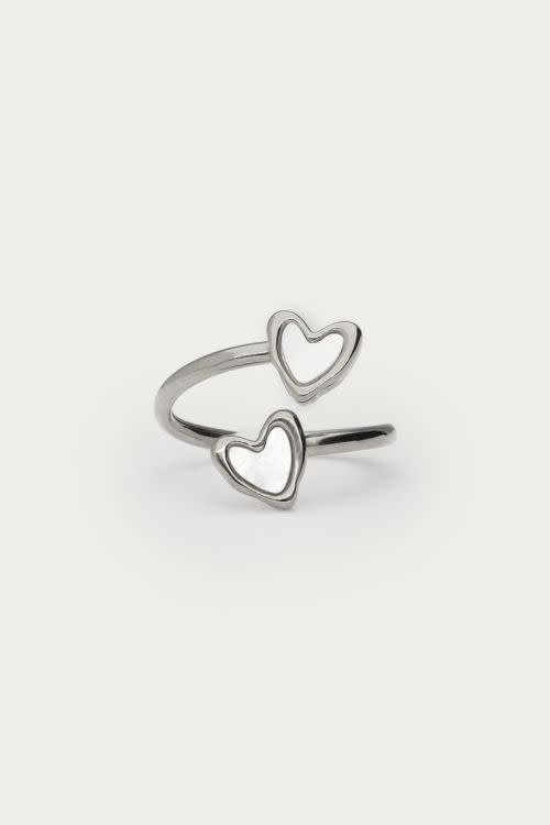 Ring met twee parelmoer hartjes zilverkleurig