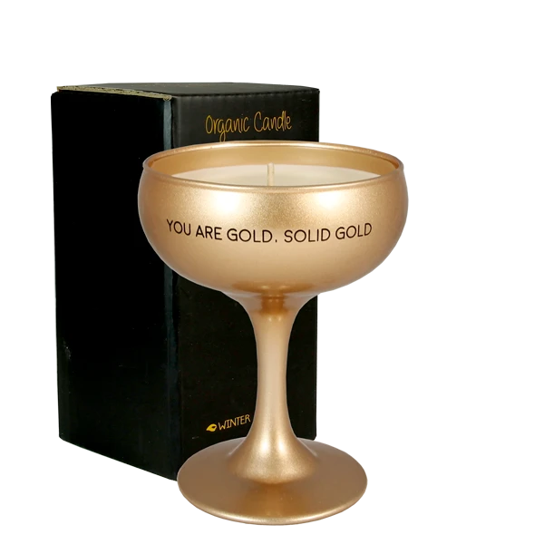Te leuke geurkaars in een champagne coupe. De kaars is gemaakt van biologische sojawas en heeft de geur Silky Tonka. Op de rand van het glas staat een toepasselijke tekst; You are gold. Solid gold. Een super leuk cadeau voor een verjaardag, als je iemand wilt bedanken of gewoon zomaar De kaars brandt ca. 30 uur.