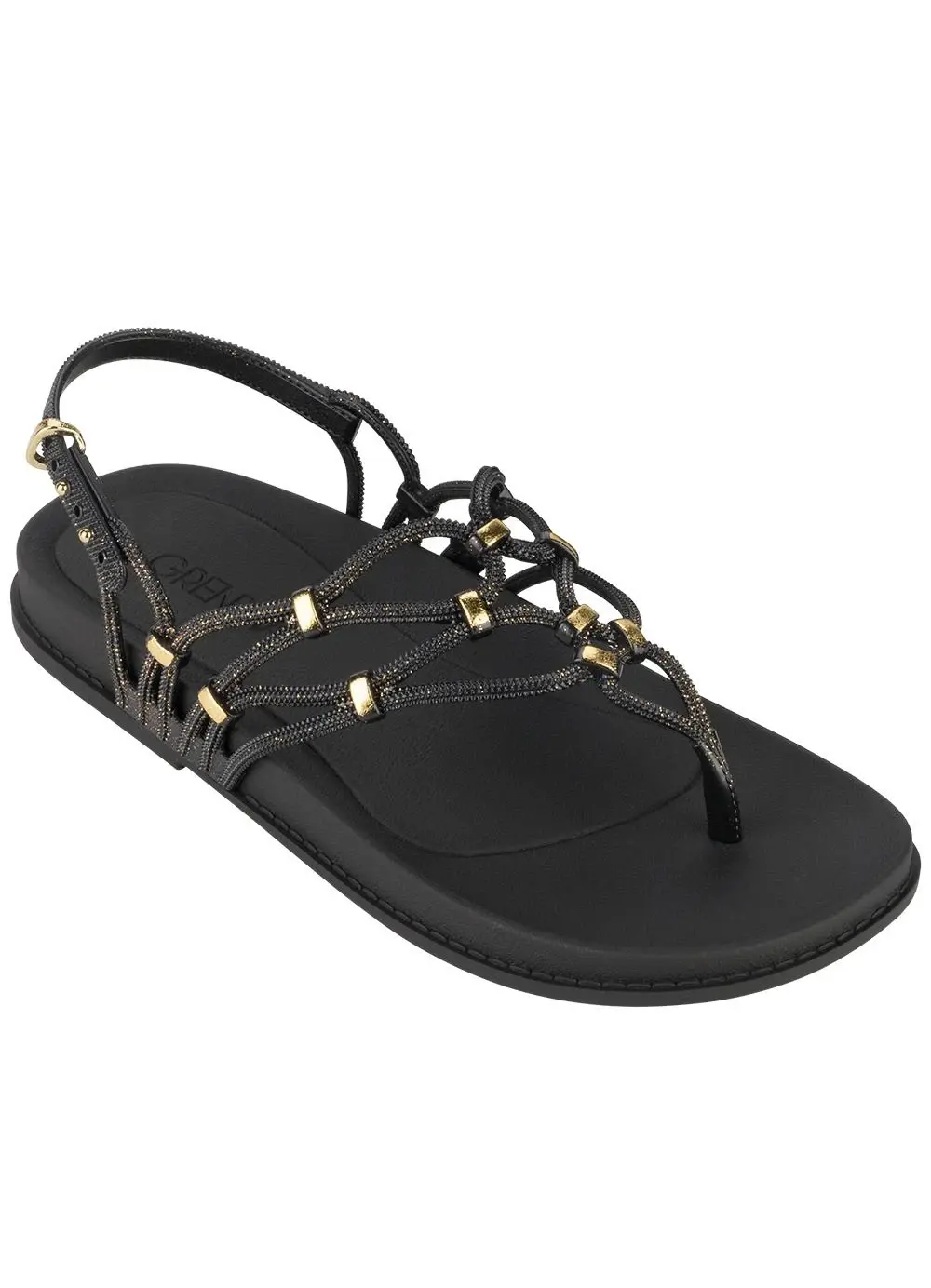 Je bent ready to rock the summer met de Grendha Instantes Black sandaal aan je voeten. Deze sandaal met teenstuk heeft een metallic applicaties voor een luxe look.