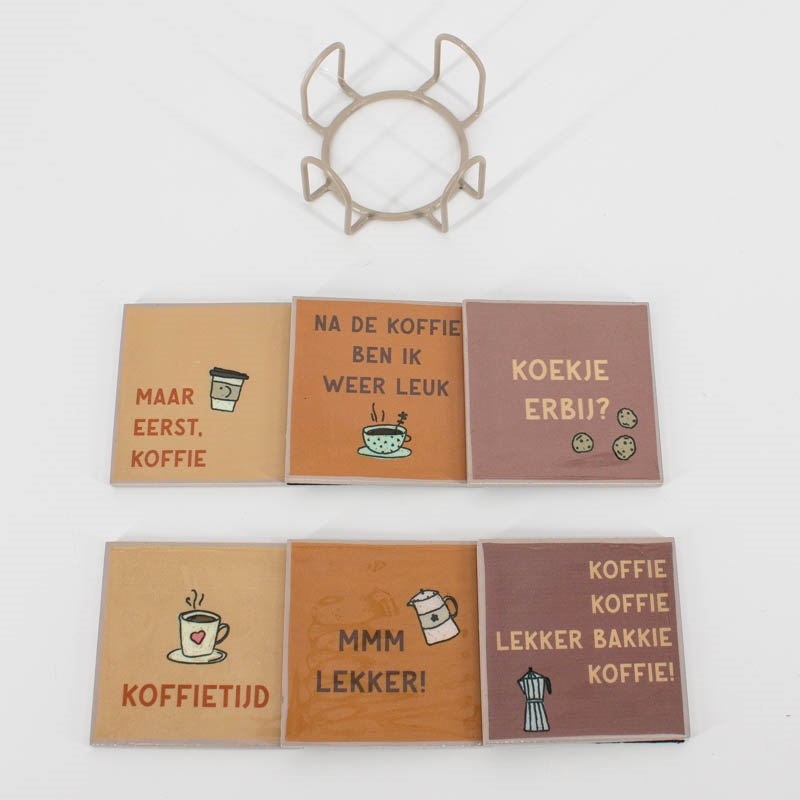 Aan verlanglijst toevoegenSet van 6 onderzetters met rekje koffie €13,95 Kleur bruin Materiaal hout Merk Kolony Op voorraad Toevoegen aan winkelwagenInloggen voor wishlist